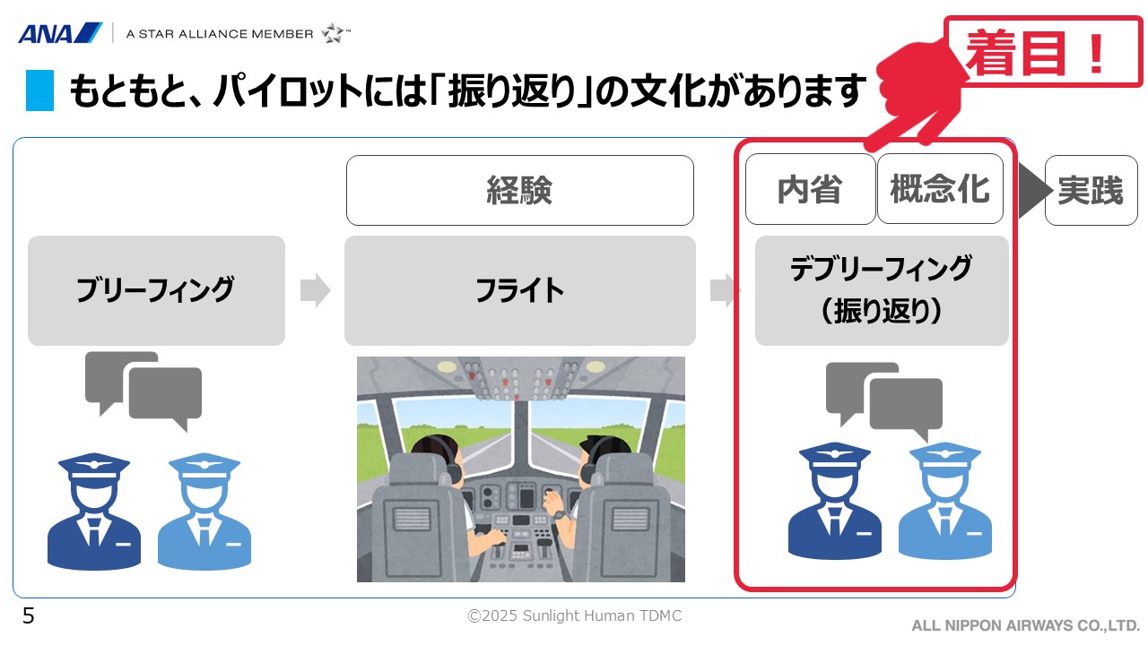 ノンテクニカルスキル(コミュニケーション、状況認識、意思決定、チームワーク、リーダーシップ等)は、頭の中で行われるプロセスが多いため、それをどう引き出し、内省させ、教訓化するかが重要であり、これがパイロット訓練改善の理由です。