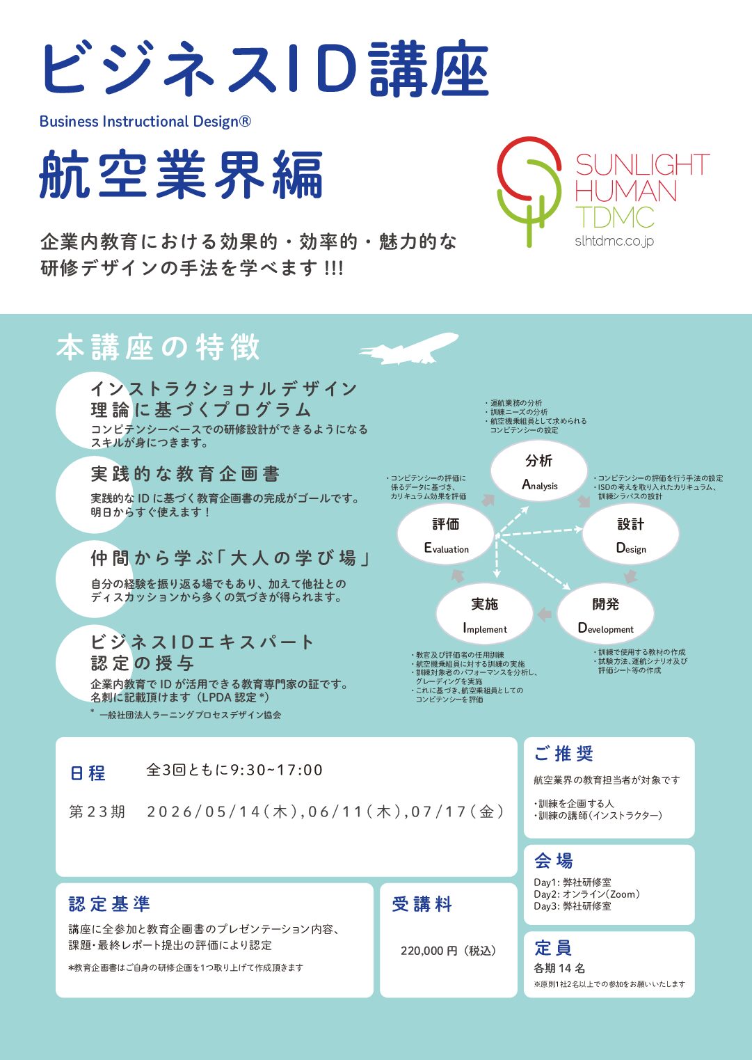 2017年3月に国土交通省航空局より、乗員向けにCBTAプログラム導入に関する通達が出されました。同プログラム導入において必要となるISD(Instructional Systems Design)の理解を深められるよう、2018年6月にビジネスID講座《航空業界編》は開講いたしました。